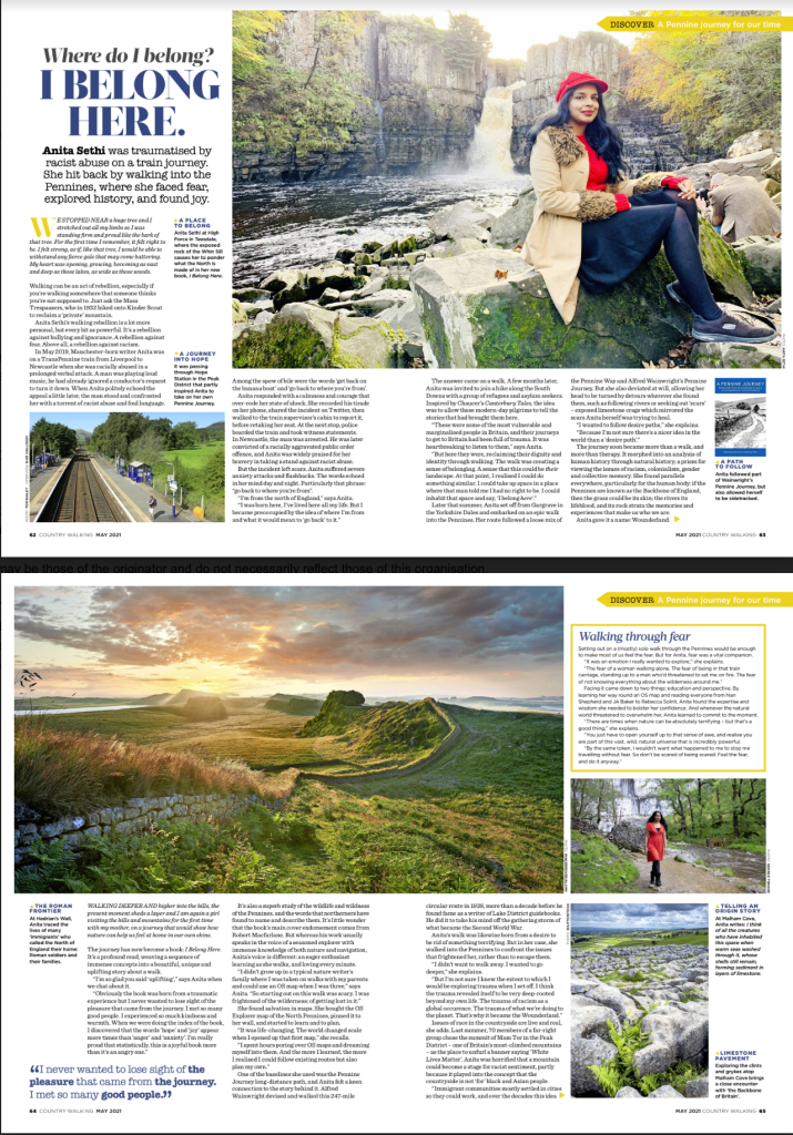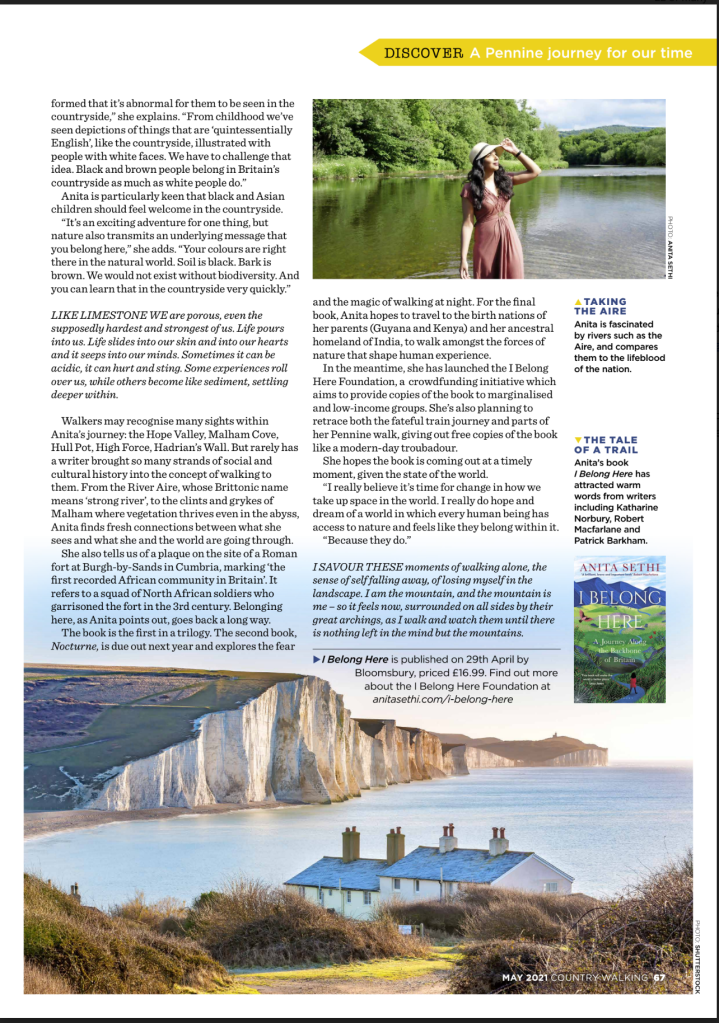 ‘I Belong Here is an extraordinary piece of place writing, not least because of Sethi’s talent for describing the Northern landscape that she encounters. Sethi’s nature writing is relatable and accessible…It’s a searingly personal book, but its themes are universal with Sethi considering topics such as loneliness, grief, what it’s like to walk alone as a woman, history, politics, freedom, protest and identity. I felt her power and emotion searing through the page. Not only is I Belong Here an original piece of nature writing, it’s also a moving read. It’s powerful, vulnerable and, above all, truthful. The perfect recipe for a memoir’ – Northern Soul